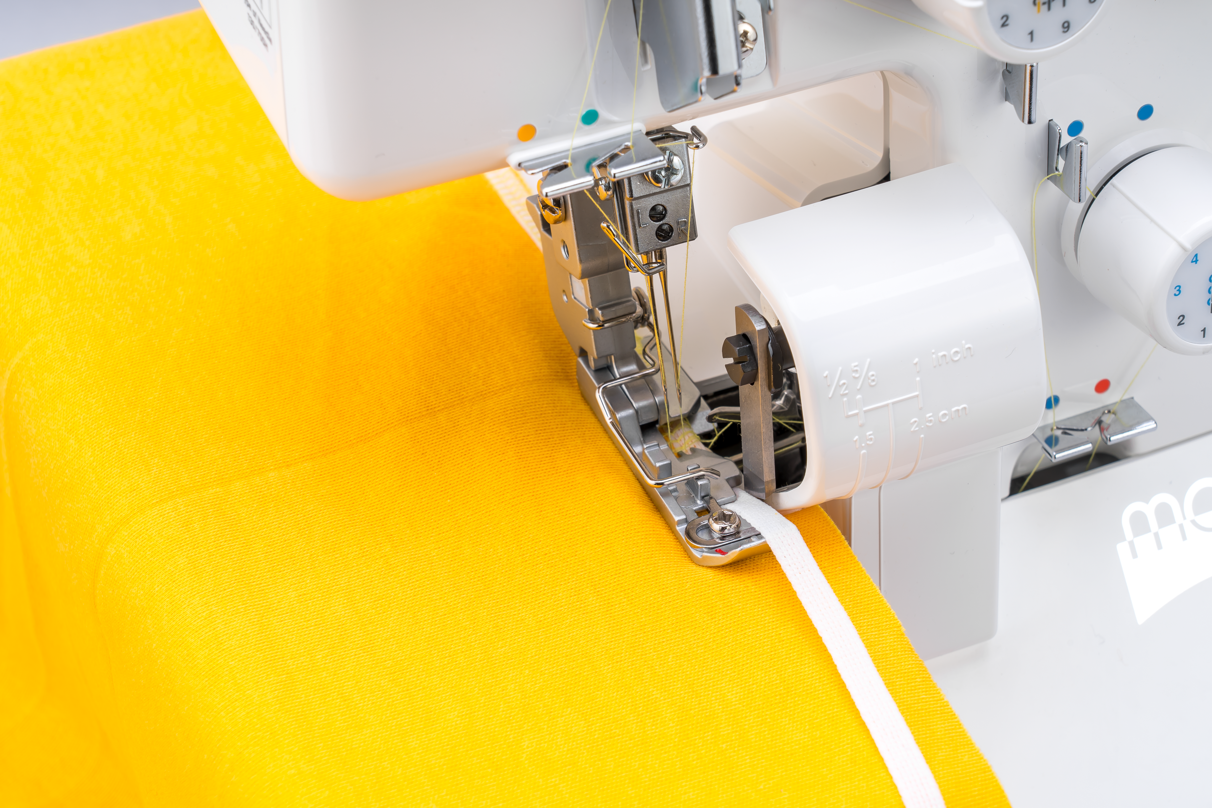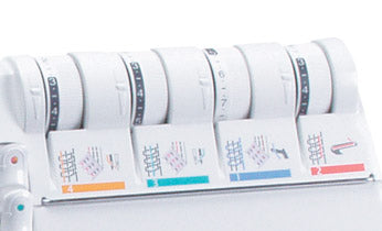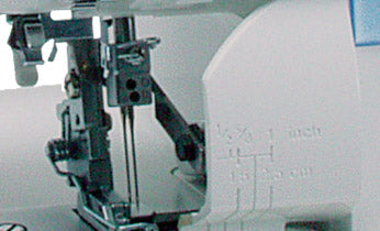 Le guide de couture intégré simplifie le calcul des marges de couture. Il suffit d'utiliser la jauge située sur le protège-couture et de surjeter, en obtenant des marges de couture précises au fur et à mesure.