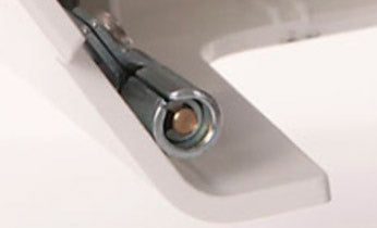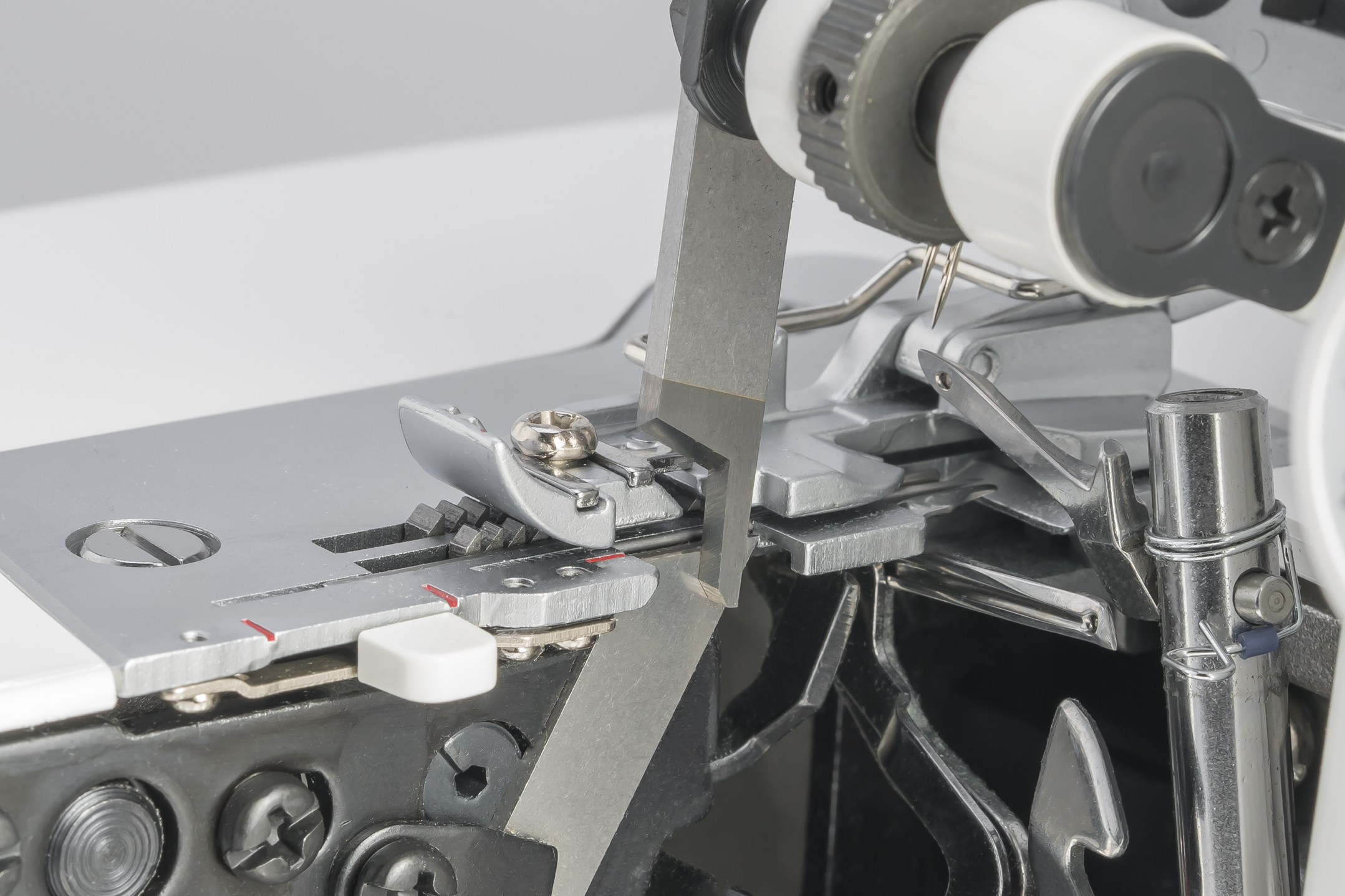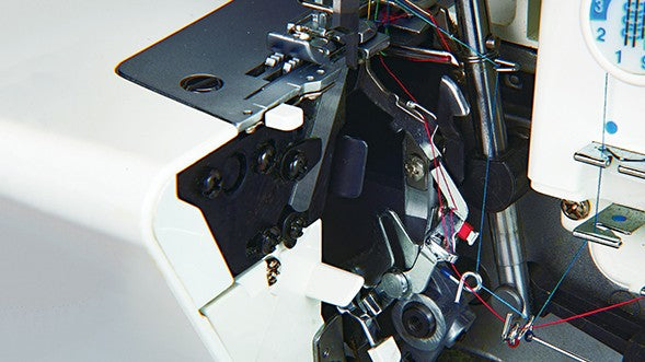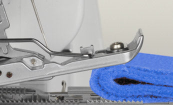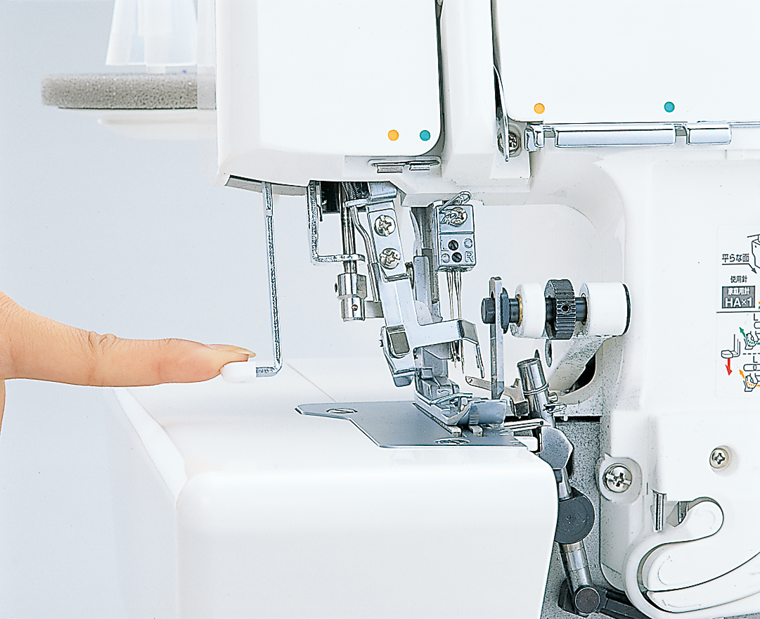 Relevé et dégagé : le bras supérieur de la lame se relève facilement d’une simple pression sur un bouton, offrant ainsi plus d’espace pour coudre. C’est particulièrement pratique en mode point de recouvrement ou lorsqu’il n’est pas nécessaire de couper le bord du tissu.
