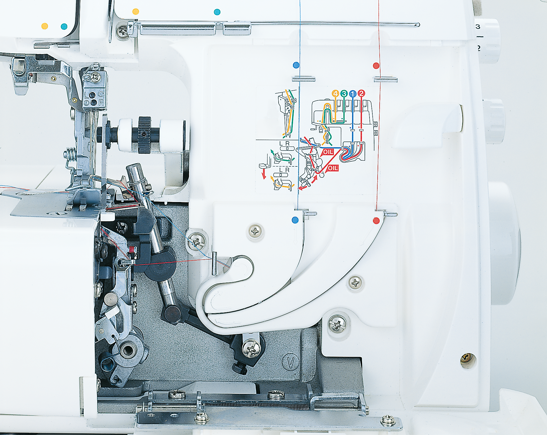 Enfiler le fil est rapide et facile grâce au système de guidage infaillible par code couleur. Il suffit de suivre les indicateurs de couleur et de placer le fil dans les guides. Simple et rapide !
